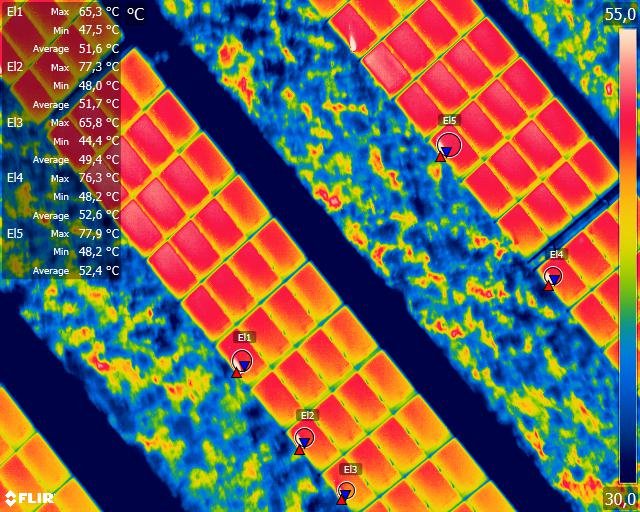 Saulės jėgainių termovizorinė analizė, saulės modulių būklės revizavimas, gedimų identifikavimas. Tyrimas atliekamas šiltuoju metų laiku esant intensyviai panelių paviršiaus apšvitai.